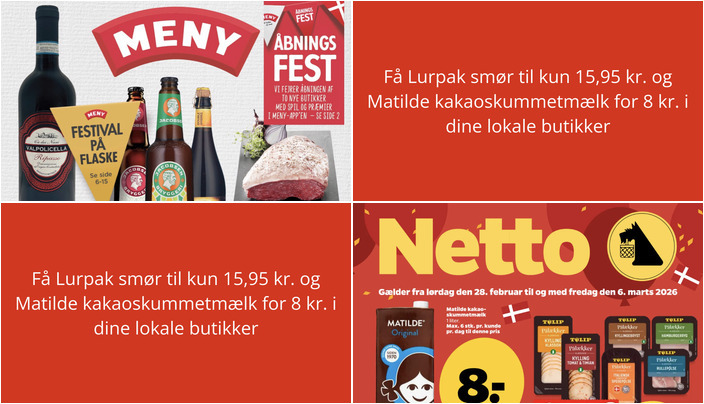 Netto tilbyder Matilde kakaoskummetmælk til en skarp pris af kun 8 kr. pr. liter. Der er en begrænsning på 6 stk. pr. kunde pr. dag til denne pris. Tilbuddet gælder fra lørdag den 28. februar til fredag den 6. marts.