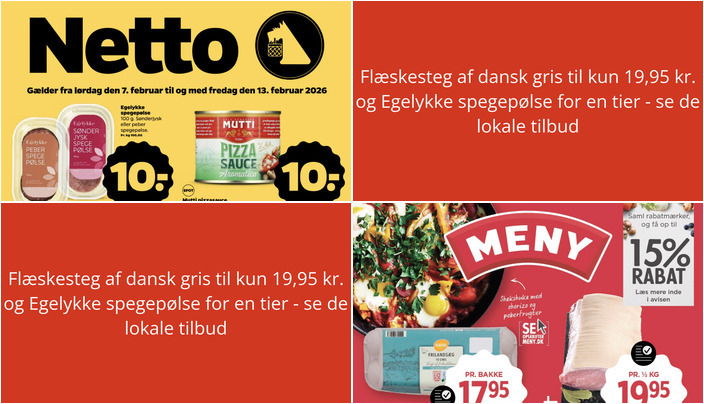 Netto tilbyder Egelykke spegepølse i enten sønderjysk eller peber variant til kun 10 kr. for 100 g. Dette tilbud er gyldigt fra lørdag den 7. februar til fredag den 13. februar.