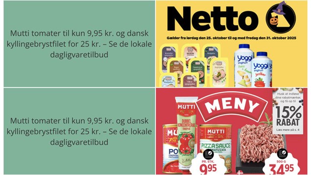 Netto tilbyder dansk kyllingebrystfilet eller -inderfilet til en pris på kun 25 kr. for 400 gram. Dette tilbud er gældende fra lørdag den 25. oktober til fredag den 31. oktober.